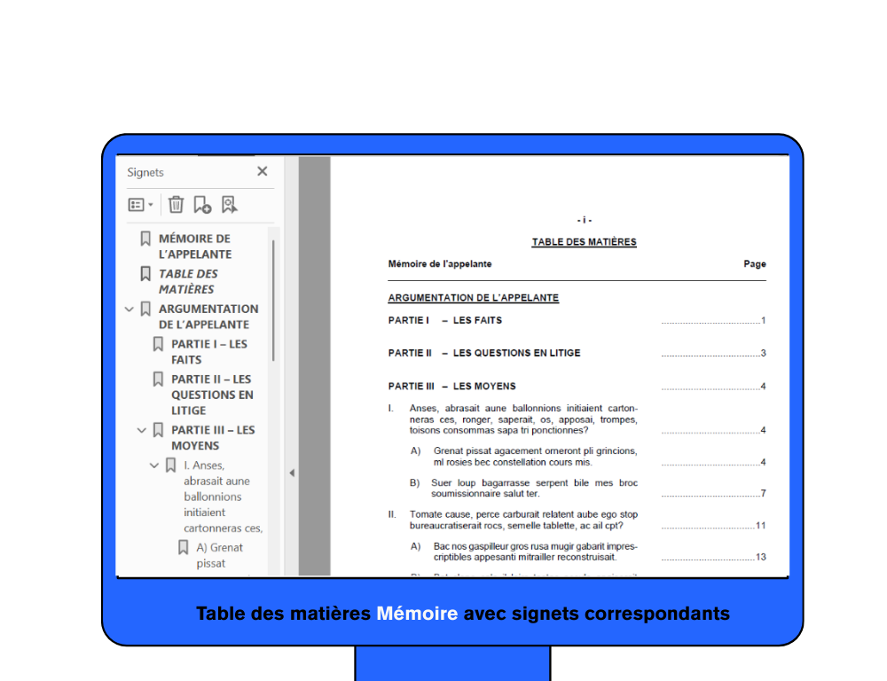 Dans un mémoire avec annexes volumineuses, un cahier de pièces ou d’engagements ou un recueil de sources avec des dizaines de décisions, ils permettent d’accéder instantanément à :